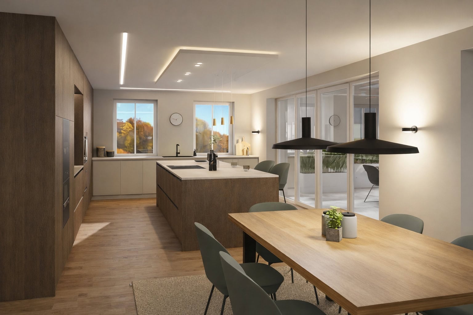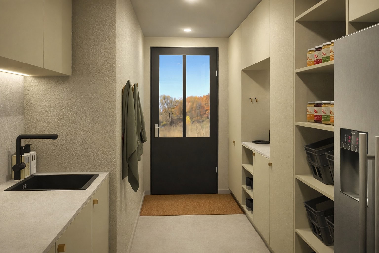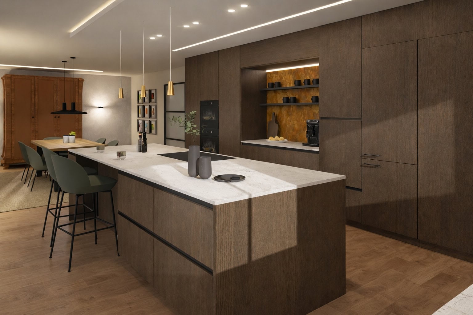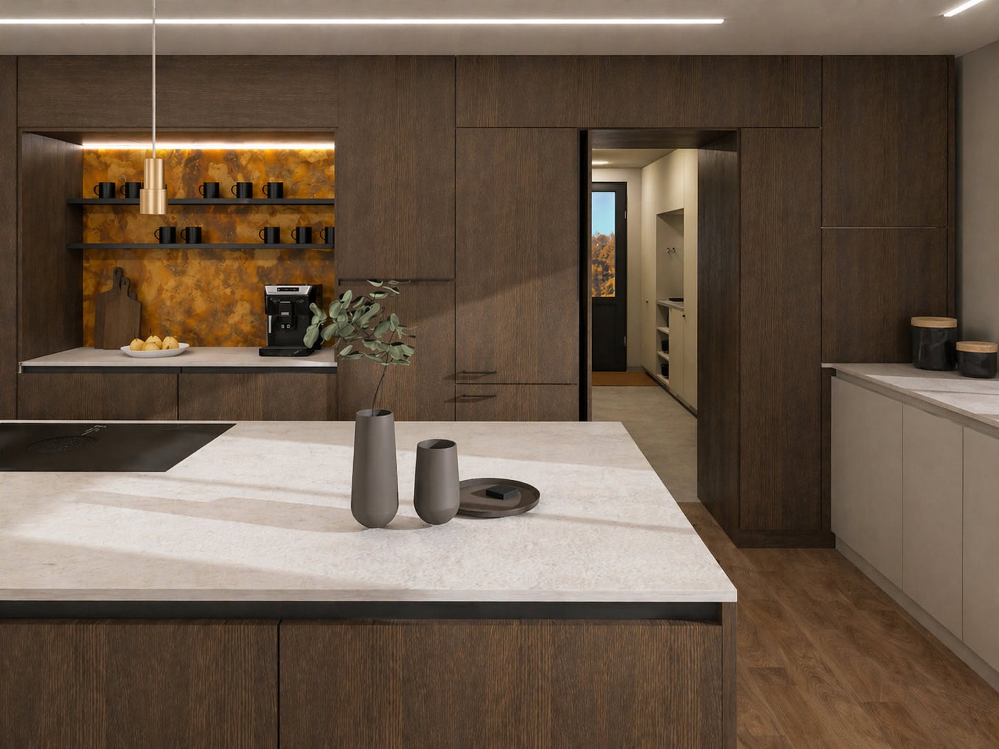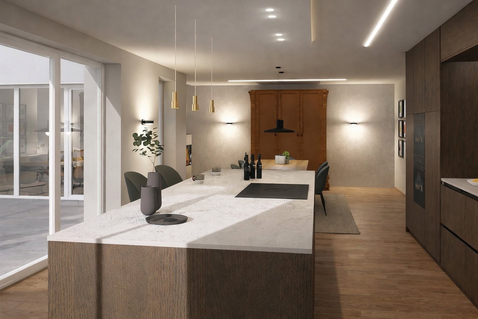 Im Zentrum des Erdgeschosses steht die große offen Küche mit versteckter Back-up-Küche.