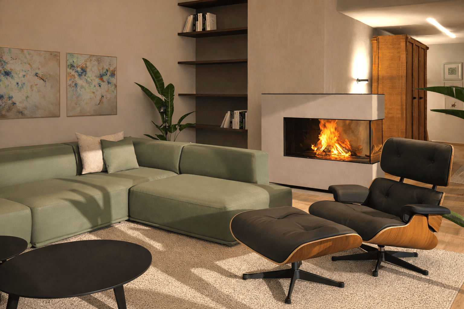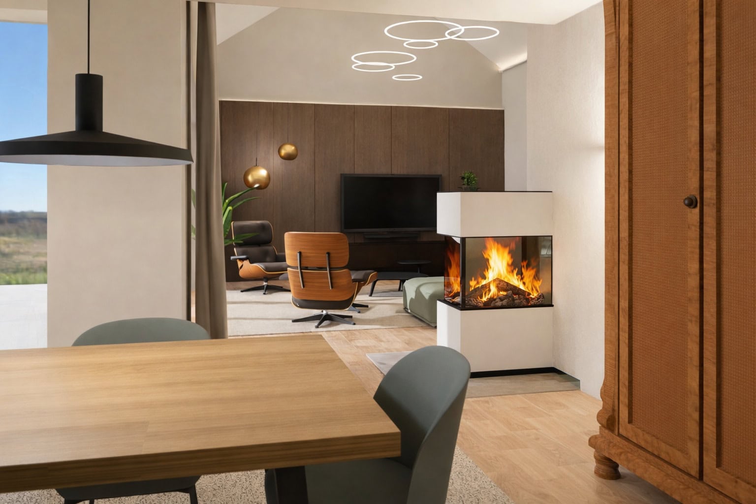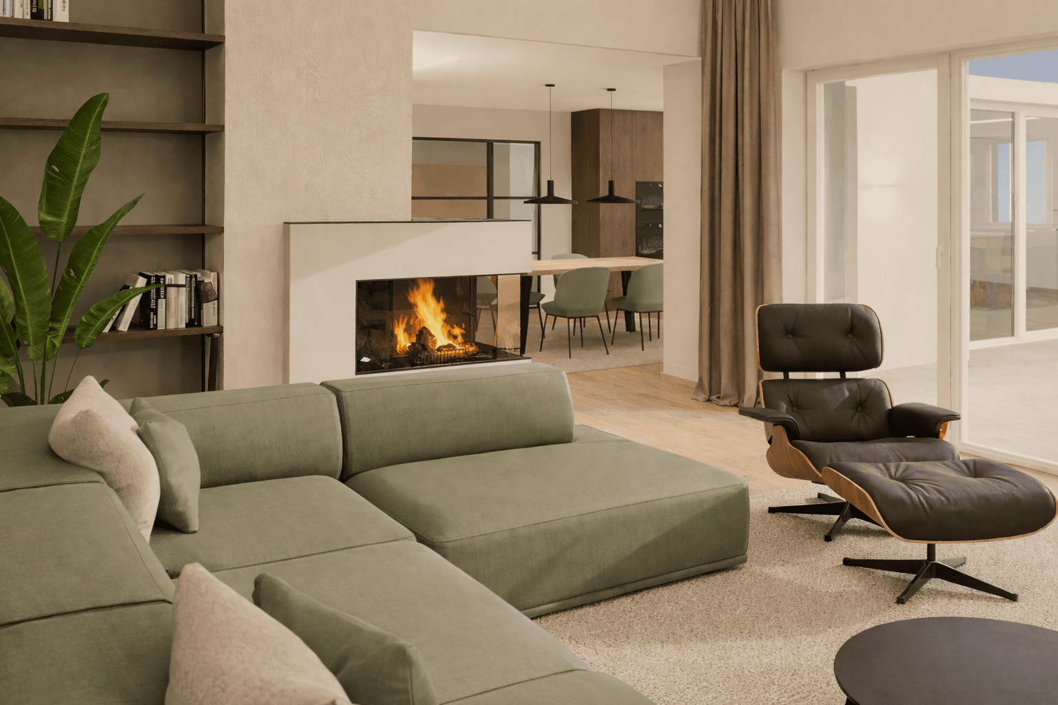 Der dreiseitige Kamin verbindet die beiden Bereiche und sorgt für zusätzliche Gemütlichkeit.