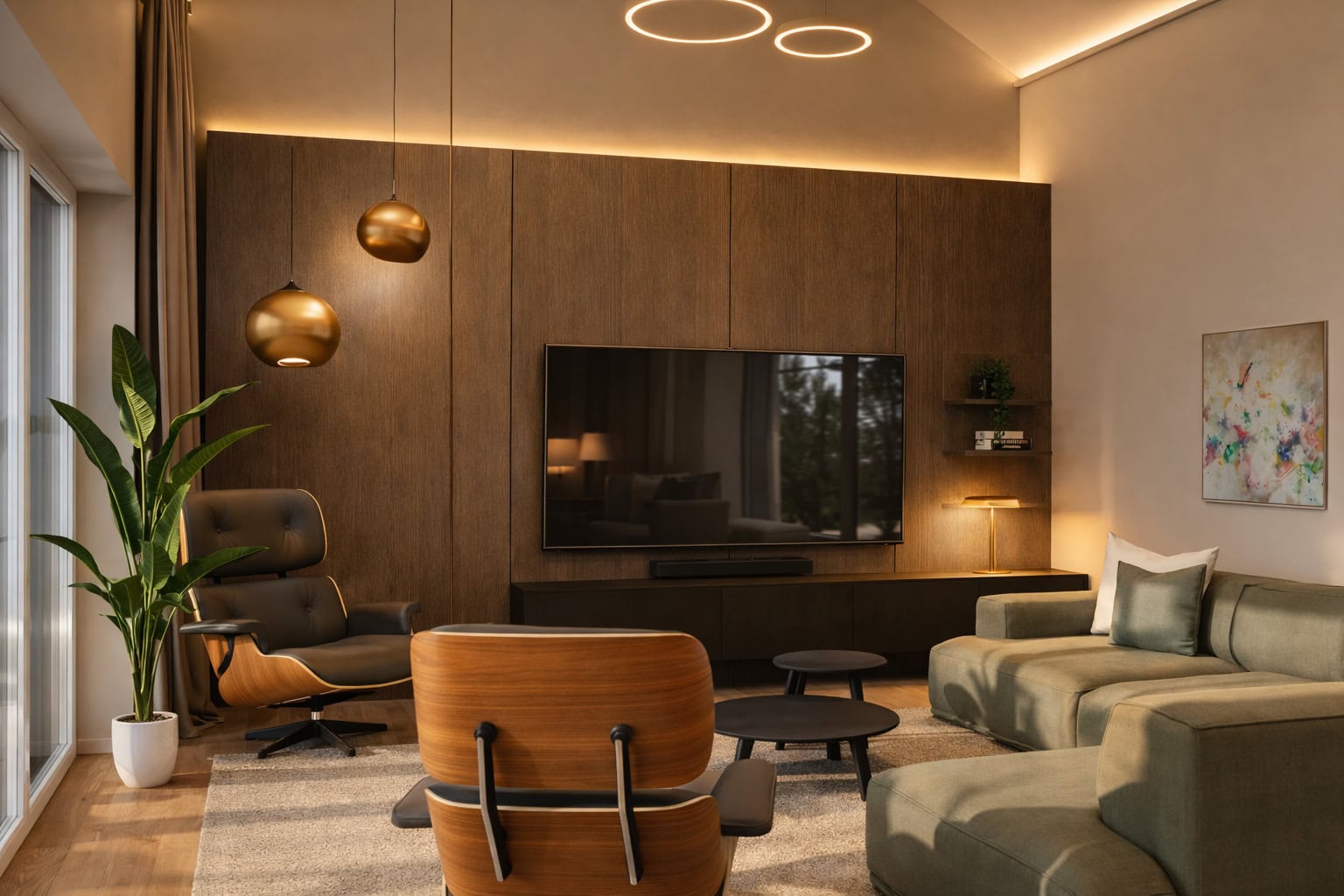 Das Wohnzimmer hat ist mit seiner besondere Höhe bis in den Giebel des Anbaus ein ganz besonderer Raum, der zum Entspannen einlädt.
